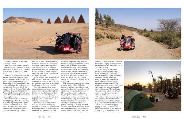 we could hear were distant sounds of the farmers singing as they worked the land around us. It was one hell of a place for a camp. The following day we made incredible progress down empty roads, through the blisteringly intense heat of the desert, stopping only to fill the tank and drink plenty of water. We rotated who was at the handlebars and who was napping in the sidecar. The napping wasn’t because we were tired but because the intense heat and pure nothingness of the landscape subdued us into a doze. Eventually we made it to Dongola where we pulled in for lunch. Dongola is a little more of a proper town and has all sorts of luxuries; the most important of which was a fridge. We smashed 2 or 3 cold cokes each and had another whopping helping of meat and bread – this time it was chicken. While we were sipping away a couple of the local TRAVERSE 123