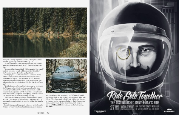 bring out a riding experience and capability that many would suggest they never realised they had. “If you have never tried adventure riding you should make it a priority to at least try it.” We can’t argue with that. “You won't be disappointed. Hiring a guide like myself tends to put some people off because they think they don't need a ‘guide’. Even I’m guilty of that. “Hiring a guide allows you to reach areas not many others dare to venture into alone because they don't know what to expect. You eliminate all the stress of organisation and carrying spare parts, equipment, you only need to focus on one thing. Having the time of your life!” With lockdown affecting North America, in particular the USA, quite hard Matt has been spending his time preparing ‘road books’ for British Colombia to enable courses teaching riders how to read these navigational tools and become prepared for rallying. It’s in his blood and the near future looks extremely exciting. “I’d love to see more people get involved in the sport,” he says. “For me personally I plan on training/riding as much as I can and go back to race the Africa Eco Race in January. Restrictions permitting, Matt is keen to get to Spain in October to train with Poskitt and become more familiar with the bike for the 2021 event. He’ll follow this with the Sonora Rally in March, then a tour season filled with riders. Then international rallies in Africa and Europe to prepare for the big one … Dakar … that’s for another time, another chat. In the meantime, we’ll keep an eye on MVMA and Matt’s racing in north west Africa. TRAVERSE TRAVERSE 42