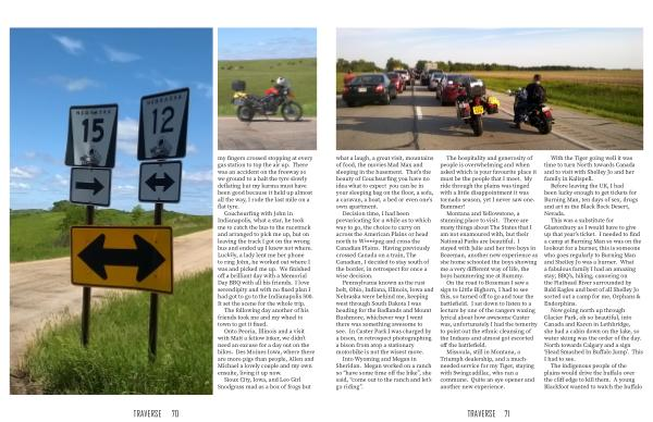 what a laugh, a great visit, mountains of food, the movies Mad Max and sleeping in the basement. That’s the beauty of Couchsurfing you have no idea what to expect you can be in your sleeping bag on the floor, a sofa, a caravan, a boat, a bed or even one’s own apartment. Decision time, I had been prevaricating for a while as to which way to go, the choice to carry on across the American Plains or head north to Winnipeg and cross the Canadian Plains. Having previously crossed Canada on a train, The Canadian, I decided to stay south of the border, in retrospect for once a wise decision. Pennsylvania known as the rust belt, Ohio, Indiana, Illinois, Iowa and Nebraska were behind me, keeping west through South Dakota I was heading for the Badlands and Mount Rushmore, whichever way I went there was something awesome to see. In Custer Park I was charged by a bison, in retrospect photographing a bison from atop a stationary motorbike is not the wisest move. Into Wyoming and Megan in Sheridan. Megan worked on a ranch so “have some time off the bike”, she said, “come out to the ranch and let’s go riding”. The hospitality and generosity of people is overwhelming and when asked which is your favourite place it must be the people that I meet. My ride through the plains was tinged with a little disappointment it was tornado season, yet I never saw one. Bummer! Montana and Yellowstone, a stunning place to visit. There are many things about The States that I am not enamoured with, but their National Parks are beautiful. I stayed with Julie and her two boys in Bozeman, another new experience as she home schooled the boys showing me a very different way of life, the boys hammering me at Rummy. On the road to Bozeman I saw a sign to Little Bighorn, I had to see this, so turned off to go and tour the battlefield. I sat down to listen to a lecture by one of the rangers waxing lyrical about how awesome Custer was, unfortunately I had the temerity to point out the ethnic cleansing of the Indians and almost got escorted off the battlefield. Missoula, still in Montana, a Triumph dealership, and a muchneeded service for my Tiger, staying with Swingcadillac, who ran a commune. Quite an eye opener and another new experience. With the Tiger going well it was time to turn North towards Canada and to visit with Shelley Jo and her family in Kalispell. Before leaving the UK, I had been lucky enough to get tickets for Burning Man, ten days of sex, drugs and art in the Black Rock Desert, Nevada. This was a substitute for Glastonbury as I would have to give up that year’s ticket. I needed to find a camp at Burning Man so was on the lookout for a burner, this is someone who goes regularly to Burning Man and Shelley Jo was a burner. What a fabulous family I had an amazing stay; BBQ’s, hiking, canoeing on the Flathead River surrounded by Bald Eagles and best of all Shelley Jo sorted out a camp for me, Orphans & Endorphins. Now going north up through Glacier Park, oh so beautiful, into Canada and Karen in Lethbridge, she had a cabin down on the lake, so water skiing was the order of the day. North towards Calgary and a sign ‘Head Smashed In Buffalo Jump’. This I had to see. The indigenous people of the plains would drive the buffalo over the cliff edge to kill them. A young Blackfoot wanted to watch the buffalo TRAVERSE 71