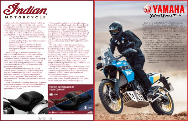 Forty years on, the Yamaha Ténéré 700 is capturing the imagination of a new generation of riders who want to discover what’s over the next horizon. And for 2020 the exclusive new Yamaha Ténéré 700 Rally Edition comes with heritage rally colours and an even higher standard specification. Featuring blue/yellow racing livery, speedblock graphics and gold rims, the Ténéré 700 Rally Edition pays tribute to the factory bikes raced by Dakar heroes Jean- Claude Olivier and Serge Bacou. With its premium components and pure Ténéré DNA, this is Yamaha’s ultimate middleweight adventure bike. The original Ténéré helped to make Yamaha the most successful brand in the Dakar, with XT models taking 18 podiums in the first 6 editions of the world’s toughest race. The pure race-bred DNA that conquered the desert has been passed through the generations to the new Yamaha Ténéré 700 Rally Edition. And it shows. Further information can be found at your local Yamaha dealer. TRAVERSE 97