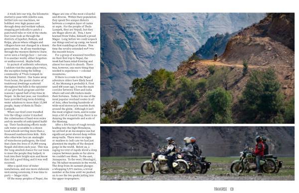 After a few hours of rough terrain leading into the high Himalayas , we arrived at an inconspicu-ous but significant point shoved deep within steep walls . There were no signs or markers to indi-cate we had just plumbed the depths of the deepest gorge in the world . Below us , a raging tor-rent of rapids sliced a deep canyon between peaks so far above we couldn ’ t see them . To the east , Annapurna . To the west , Dhaulagiri , the 7th tallest mountain in the world . The drop from its summit plunges a whopping 5,571 metres , a trivial number at the time until we pushed on to see the two peaks jutting into the upper troposphere .