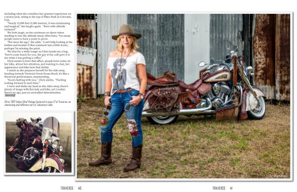 Chris ' 2017 Indian Chief Vintage featured in issue 17 of Traverse , an interesting and different sort of ' adventure ' bike .