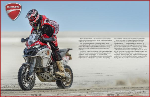 " Since 2016 I started working with Ducati on the development of the Multistrada Enduro project ," explained Rossi . " I know very well its potential , its robustness and its countless qualities , which is why it was decided to participate in a demanding rally like the Transanatolia with a practically standard bike ."