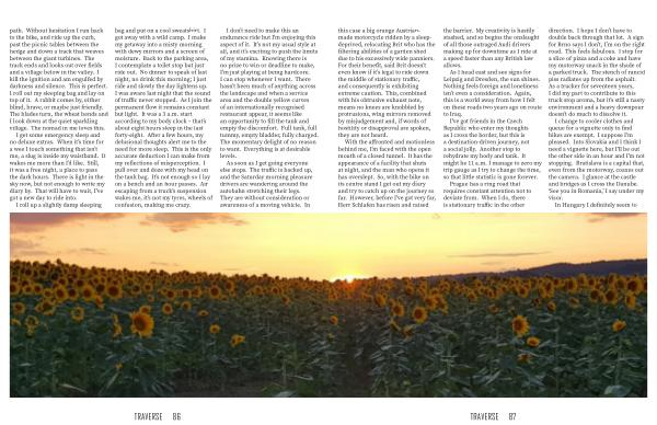 I roll up a slightly damp sleeping bag and put on a cool sweatshirt . I got away with a wild camp . I make my getaway into a misty morning with dewy mirrors and a screen of moisture . Back to the parking area , I contemplate a toilet stop but just ride out . No dinner to speak of last night , no drink this morning ; I just ride and slowly the day lightens up . I was aware last night that the sound of traffic never stopped . As I join the permanent flow it remains constant but light . It was a 3 a . m . start according to my body clock – that ’ s about eight hours sleep in the last forty-eight . After a few hours , my delusional thoughts alert me to the need for more sleep . This is the only accurate deduction I can make from my reflections of misperception . I pull over and doze with my head on the tank bag . It ’ s not enough so I lay on a bench and an hour passes . Air escaping from a truck ’ s suspension wakes me , it ’ s not my tyres , wheels of confusion , making me crazy .