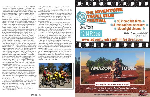 Deacon and I could pack the paniers and ride to where we wanted to go . The annual KTM Adventure Rider Rally , typically held at ski resorts , became our favorite event to attend . Our first two weeks ’ ride away from home was to venture down Baja California with a small organised group of riders , led by Lawrence Hacking ( a past Dakar racer ). Everyone was Canadian , except me .