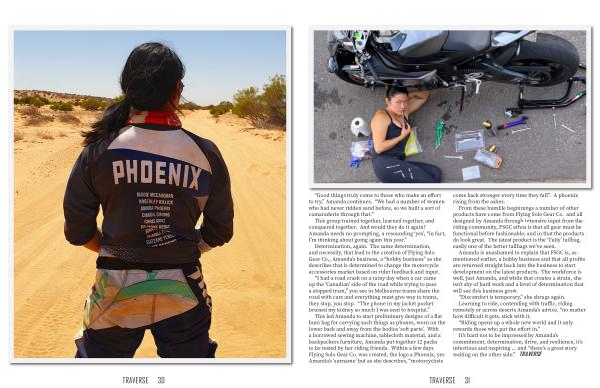 Amanda is unashamed to explain that FSGC is , as mentioned earlier , a hobby business and that all profits are returned straight back into the business to start development on the latest products . The workforce is well , just Amanda , and while that creates a strain , she isn ’ t shy of hard work and a level of determination that will see this business grow . “ Discomfort is temporary ,” she shrugs again . Learning to ride , contending with traffic , riding remotely or across deserts Amanda ’ s advice , “ no matter how difficult it gets , stick with it .