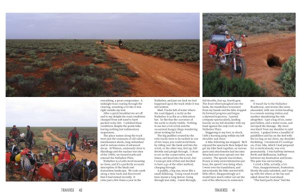 A bike following me stopped . He ’ d enjoyed the spectacle then helped me get my bike back together , as various parts and attachments had become detached and were spread over the country . The speedo was broken , frozen at sixty seven kilometres per hour , the speed I was doing when I went over the handlebars , and miraculously the bike started with little effort , disappointingly as I would have much rather sat out the rest of the afternoon in someone ’ s ute . It wasn ’ t far to the Nullarbor Roadhouse , and stories like mine abounded , with one victim heading to a remote nursing station and another abandoning the ride altogether . I got a bag of ice , some pain killers , and a motel room , and surveyed the damage . My chest was black from my shoulder to mid section . I gulped down a handful of painkillers and lay on the bed with the ice bag on my chest , my shoulder throbbing . I wondered if I could go on , if my ride , which I had prepared for so meticulously , was over prematurely . I was halfway between Perth and Melbourne , halfway between my destination and home . The pain was excruciating . I cried a little , actually , a lot . Pain , disappointment , frustration . Slowly the pain subsided , and I met up with the others at the bar and asked about the road ahead .