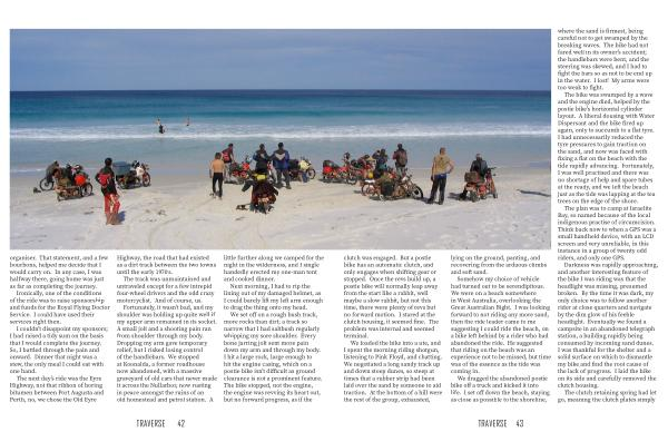 We set off on a rough bush track , more rocks than dirt ; a track so narrow that I had saltbush regularly whipping my sore shoulder . Every bone jarring jolt sent more pain down my arm and through my body . I hit a large rock , large enough to hit the engine casing , which on a postie bike isn ’ t difficult as ground clearance is not a prominent feature . The bike stopped , not the engine , the engine was revving its heart out , but no forward progress , as if the