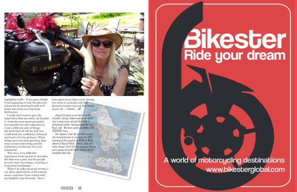 The ' sojourn ' over the northern winter she mentioned was to recreate the 1950 crossing of the country by Winifred Wells , aboard a Royal Enfield . There ' s little that stops Jacqui , Covid did , but she sees this as just a pause and will return downunder to complete that ride .