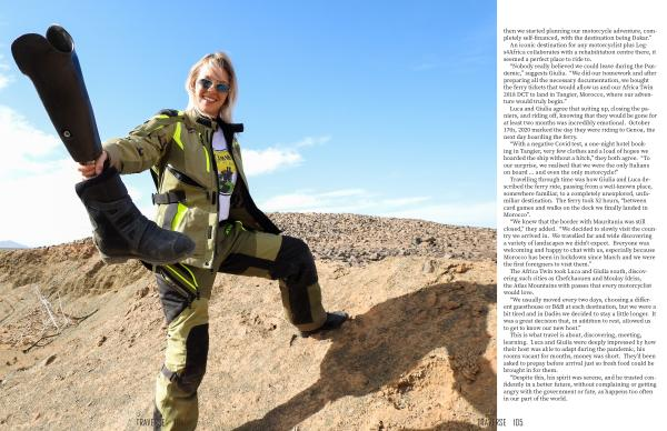 “ Nobody really believed we could leave during the Pandemic ,” suggests Giulia . “ We did our homework and after preparing all the necessary documentation , we bought the ferry tickets that would allow us and our Africa Twin 2018 DCT to land in Tangier , Morocco , where our adventure would truly begin .”