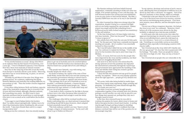 Alex was on the Asian leg of his ride across the world , from Europe to Australia almost a year earlier . Observing that there was no social distancing , no panic , no serious changes to life .