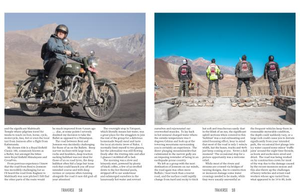 From previous experience I knew that the road from Beni to Jomsom was incredibly challenging but as I ’ d heard the road from Kagbeni to Muktinath was now pitched I felt that the other parts of the route would be much improved from 4 years ago … alas , at some points I severely doubted my decision to take the Bullet as opposed to a Himalayan . The road between Beni and Jomsom was decidedly challenging for those of us on the Bullets . Steep narrow inclines with large loose rocks and boulders , deep traction sucking bulldust was not ideal for those of us on road tyres , the deep bulldust often hid a large but loose rock that could launch you off your intended course and with deep ravines or canyons often running alongside the road it sure did grab all your attention !