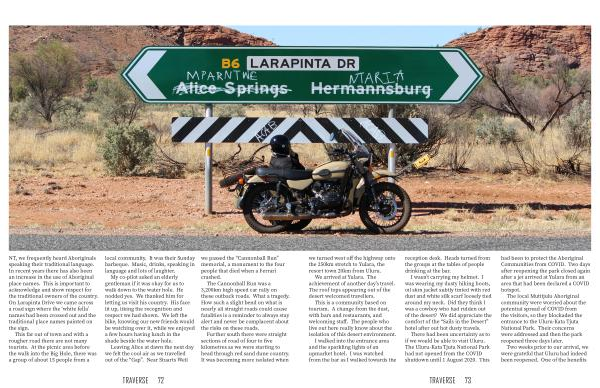 NT , we frequently heard Aboriginals speaking their traditional language . In recent years there has also been an increase in the use of Aboriginal place names . This is important to acknowledge and show respect for the traditional owners of the country . On Larapinta Drive we came across a road sign where the ‘ white fella ’ names had been crossed out and the traditional place names painted on the sign .