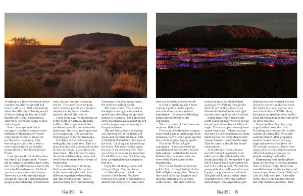 There is the transition from the golden hour , through twilight to the field of light coming alive . There is the sound of joy and laughter and then the changing colour tones of the sunset . The view of Uluru transitioning to the field of light coming alive . Walking through the field of light is like you are in an illuminous field of tulips with light patterns moving in waves of colours . Riding back from Yulara to the north-south highway we were seeing the red sand dunes from a different angle . The area appears to only have sparse vegetation . When you stop and take a closer look there are many plant species . So many shrubs with unique flowers . Don ’ t race through . Take the time to absorb this desert environment .