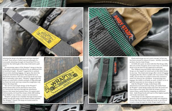 An interesting aspect of the Wraptie™ straps is that the full length is elasticated and allows for an additional 30 % of stretched length . Wraptie™ suggest this is optimal for securely attaching luggage , we agree , the more the straps are stretched the greater they pulled back on themselves however , this also meant the hook and loops did occasionally come apart . Wraptie™ suggest that the straps are rated with a tensile strength of 50kg although we think the hook and loop connection might give way before the straps fail .