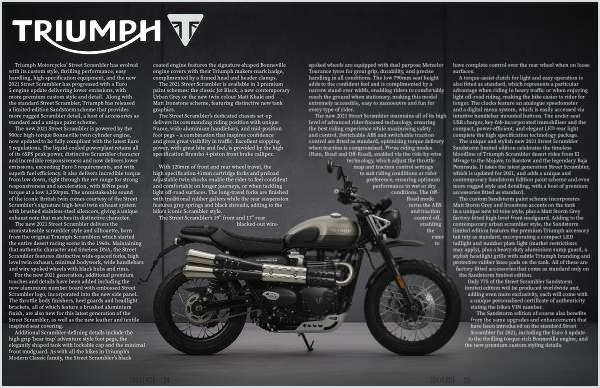 Triumph Motorcycles ’ Street Scrambler has evolved with its custom style , thrilling performance , easy handling , high specification equipment , and the new 2021 Street Scrambler has progressed with a Euro 5 engine update delivering lower emissions , with more premium custom style and detail . Along with the standard Street Scrambler , Triumph has released a limited-edition Sandstorm scheme that provides more rugged Scrambler detail , a host of accessories as standard and a unique paint scheme .