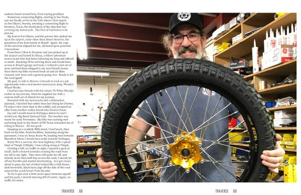 From there I flew to Houston and was picked up at the airport and hosted by Brian , a fellow adventure motorcyclist who had been following my blog and offered to assist . Knowing I ’ d be arriving there and would have access to Brian ’ s garage and tools , I ordered a new set of tyres and had them shipped to my new friend ’ s home . Once there my bike received fresh oil and air filter cleaned , new tyres and a general going over . Ready to hit the road again !