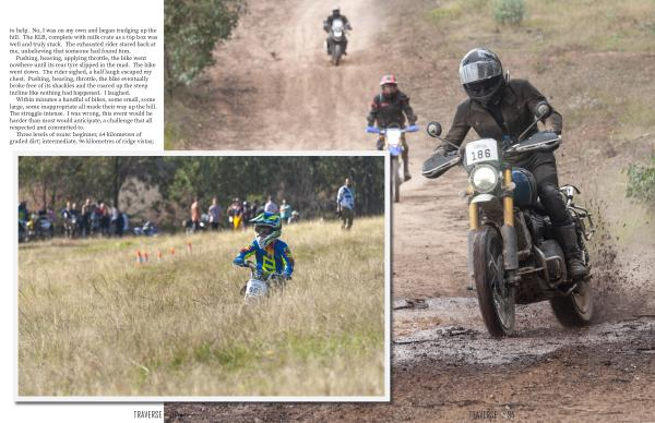Pushing , heaving , applying throttle , the bike went nowhere until its rear tyre slipped in the mud . The bike went down . The rider sighed , a half laugh escaped my chest . Pushing , heaving , throttle , the bike eventually broke free of its shackles and the roared up the steep incline like nothing had happened . I laughed .