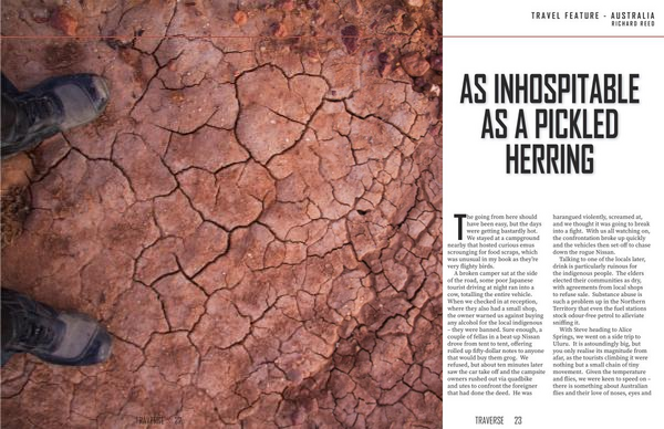 A broken camper sat at the side of the road , some poor Japanese tourist driving at night ran into a cow , totalling the entire vehicle . When we checked in at reception , where they also had a small shop , the owner warned us against buying any alcohol for the local indigenous – they were banned . Sure enough , a couple of fellas in a beat-up Nissan drove from tent to tent , offering rolled up fifty-dollar notes to anyone that would buy them grog . We refused , but about ten minutes later saw the car take off and the campsite owners rushed out via quadbike and utes to confront the foreigner that had done the deed . He was harangued violently , screamed at , and we thought it was going to break into a fight . With us all watching on , the confrontation broke up quickly and the vehicles then set-off to chase down the rogue Nissan .