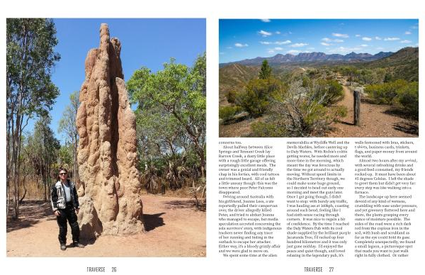 We spent some time at the alien memorabilia at Wycliffe Well and the Devils Marbles , before cantering up to Daly Waters . With Richie ’ s colitis getting worse , he needed more and more time in the morning , which meant the day was ferocious by the time we got around to actually moving . Without speed limits in the Northern Territory though , we could make some huge ground , so I decided to head out early one morning and meet the guys later . Once I got going though , I didn ’ t want to stop : with barely any traffic , I was hauling ass at 160kph , coasting around each bend , feeling like I had sixth sense racing through corners . It was nice to regain a bit of confidence . By the time I reached the Daly Waters Pub with its cool shade supplied by the brilliant purple Jacaranda Tree , I ’ d racked up four hundred kilometres and it was only just gone midday . I ’ d enjoyed the peace and quiet though , and loved relaxing in the legendary pub , it ’ s walls festooned with bras , stickers , t-shirts , business cards , trinkets , flags , and paper-money from around the world .