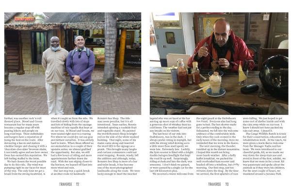 We had chosen the worst possible day to do this ride . The wind was pumping right in our faces for most of the way . The only time we got a break from the strong headwind , is when it caught us from the side . We travelled slowly with lots of stops and lots of hiding from the sausage machine of rain squalls that kept us on our toes . At Diesel and Cream , we were seated right next to a roaring fire where we could dry out our gear and dethaw ourselves . It was awfully hard to leave . When Dean offered us accommodation in a couple of their upstairs suites , we almost grabbed the opportunity . But alas , we still had a few hours of riding and more appointments further down the road . With the sun edging closer to the horizon , we buzzed off East into more wind and rain .