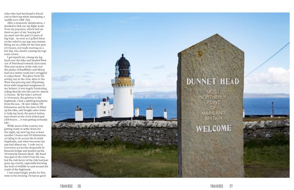While most of the country was getting ready to settle down for the night , my next leg was at least another 3 hours and 193 kilometres of riding to do across the Scottish Highlands , and what was more the sun had almost set . I rode out of Inverness across the eloquently lit Kessock bridge and headed up the A9 towards Dunnet Head . My head was glad of the relief from the sun , but the risk factor of the ride had just gone up a notch , especially knowing the level of wildlife in and around the roads of the highlands .
