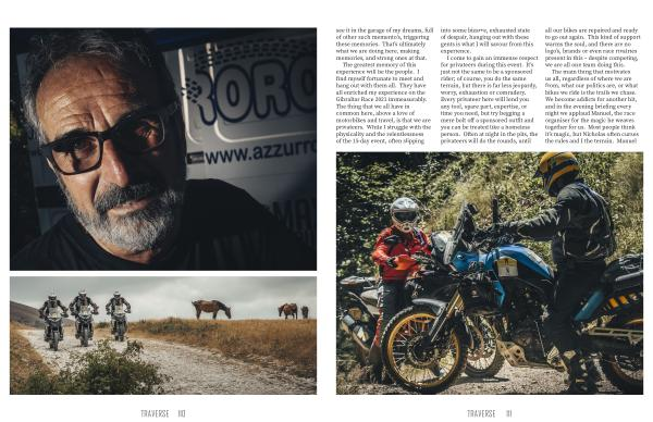 The greatest memory of this experience will be the people . I find myself fortunate to meet and hang out with them all . They have all enriched my experience on the Gibraltar Race 2021 immeasurably . The thing that we all have in common here , above a love of motorbikes and travel , is that we are privateers . While I struggle with the physicality and the relentlessness of the 15-day event , often slipping
