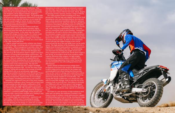 Aprilia chassis architectures have always been recognised as the best in the world for effectiveness in sport riding and in particular for the unique and unmistakeable front wheel feeling that they provide . They are the result of a design and construction culture derived directly from the experience of Aprilia Racing which has already resulted in 54 world titles . The Tuareg 660 chassis architecture , as is already the case with its street bike siblings , aims to raise the bar in the category , both on and off road . Everything is obviously very different to RS and Tuono given it was designed for “ heavy duty ” use – namely for demanding off-road riding , with the significant cargo capacity an additional factor .
