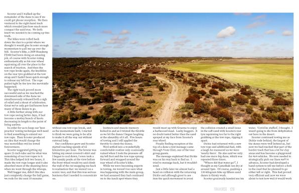 “ Where did that water go ?”, I thought as my Camelbak ran dry at around 3pm . Of course , pushing a 110-kilogram bike up fifteen sand dunes is thirsty work .