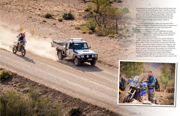 Adventure riders are a varied lot , and the Flinders Classic attracts the complete gamut . Sixteen-year-old girls , riding XT250s are joined by seventy-year-old men on DRs . Lead riders , Martin Winters , Con Giagtzis , and Richard Ramsey chat amongst their teams , explaining what to expect , the terrain , the weather , the conditions . Rides are loops of between 100 and 300 kilometres , starting and returning to the Angorichina Village .