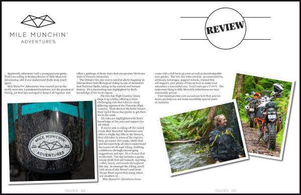 REVIEW come with a full back up crew as well as knowledgeable tour guides . The two-day rides include , accommodation , all meals , beverages , support vehicle , trained first aid support , plus plenty of tips on how to make your adventure a successful one . You ’ ll even get a T-shirt . The important thing is Mile Munchin Adventures are very reasonably priced .