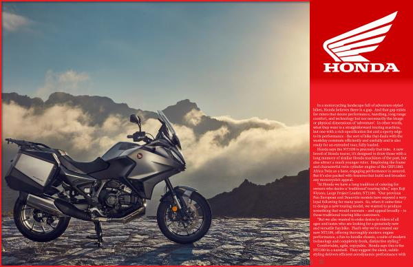 Honda says the NT1100 is precisely that bike . A new breed of Honda tourer , it ’ s designed to draw those with a long memory of similar Honda machines of the past , but also attract a much younger rider . Employing the frame and characterful twin-cylinder engine of the CRF1100L Africa Twin as a base , engaging performance is assured . But it ’ s also packed with features that build and broaden any motorcycle ’ s appeal .