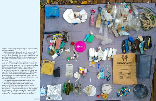 In total Keith worked in three locations across eleven days , all on Australia ’ s Cape York Peninsula , retrieving a total of 7.3 tonnes of rubbish . Yet , according to Tangaroa Blue this is just the beginning . To 2018 Tangaroa Blue volunteers had worked on almost 4,000 locations around Australia removing 1,434 tonnes of rubbish , the equivalent of 1,000 average sized cars . Two of the larger clean-ups were after natural disasters , two category 5 cyclones during 2015 . One in Yeppoon and the other at Cape Bedford and retrieved 1.2 tonnes of plastic for every 500 metres of beach .