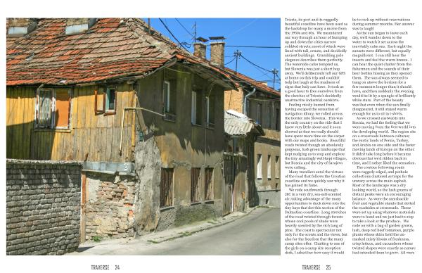 Trieste , its port and its ruggedly beautiful coastline have been used as the backdrop for many a movie from the 1950s and 60s . We meandered our way through an hour of bumping up and down the cities narrow cobbled streets ; most of which were lined with tall , ornate , and decidedly ancient buildings . Crumbling pale elegance describes them perfectly . The waterside cafes tempted us , but Slovenia was just a short hop away . We ’ d deliberately left our GPS at home on this trip and couldn ’ t help but laugh at the madness of signs that Italy can have . It took us a good hour to free ourselves from the clutches of Trieste ’ s decidedly unattractive industrial outskirts . Feeling nicely buzzed from having escaped the sensation of navigation idiocy , we rolled across the border into Slovenia . This was the only country on the ride that I knew very little about and it soon showed us that we really should have spent more time on the carpet with our maps and books . Beautiful roads twisted though an absolutely gorgeous , lush green landscape that kept nudging us to stop and explore the tiny amazingly well-kept villages , but Bosnia and the city of Sarajevo were calling .