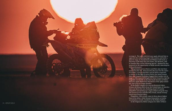 Young brands such as Sherco and Hero also had their moment in the sun . Ensconced in the top 5 for the entire first week , Lorenzo Santolino and his Sherco expected to feature in the fight for glory before the tables turned . Hero and Joaquim Rodrigues bagged their maiden win in stage 3 , with a special thought for Paolo Gonçalves , Speedy tragically lost his life on the first Saudi iteration of Dakar . Red once again fluttered in the breeze of the aptly named sea , but it was no longer Honda ' s .