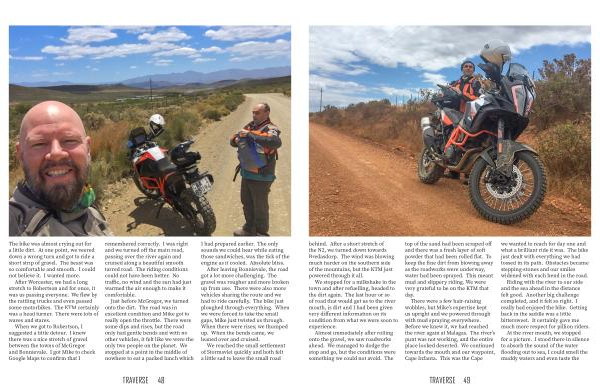 After leaving Bonnievale , the road got a lot more challenging . The gravel was rougher and more broken up from use . There were also more vehicles sharing the route and we had to ride carefully . The bike just ploughed through everything . When we were forced to take the small gaps , Mike just twisted us through . When there were rises ; we thumped up . When the bends came , we leaned over and cruised .