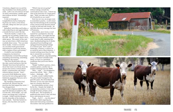 “ Fuck the masks ,” a reply to my apology for not putting a mask on in his café . Scruffy , round , black t-shirt , white apron . The owner of the café was an extra from a 1960 ’ s American roadside diner scene . “ You can stick those masks . Covid is a creation of a socialist world government determined to control the masses with a regime of fear and tyranny .”
