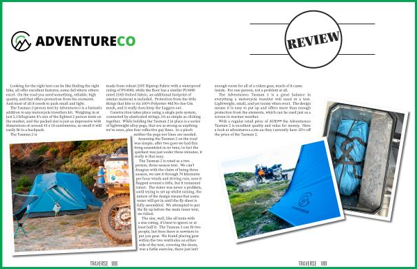 The Adventureco Tasman 2 is a great balance in everything a motorcycle traveller will need in a tent . Lightweight , small , and yet roomy when erect . The design means it is easy to put up and offers more than enough protection from the elements , which can be used just as a screen in warmer weather .