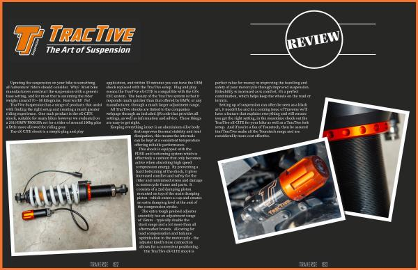 TracTive Suspension has a range of products that assist with finding the right setup and creating a much greater riding experience . One such product is the eX-CITE shock , suitable for many bikes however we evaluated on a 2016 BMW F800GSA set for a rider of around 100kg plus a little more allowed for riding gear .