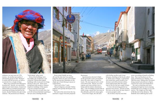 thermoses . Speedometres showed 113kph on the good dirt road as we headed down the other side to Tingri for lunch . We were spread out to avoid each others dust . Binod , our road captain , got some airtime over a bump and his battery abandoned ship . A bit of stuffing around with an elastic strap , a push start ( not easy at this altitude ), and we ’ re away again . From New Tingri , the old one ’ s a bit further up the road , it was bitumen , blacktop as the locals called it , all the way to Shegar . A genuinely nice hotel here , quite modern , hot showers and with sit down toilets , much appreciated after the squat type in use for the last couple of days . A very cold morning greeted us . Streams were frozen . Sunrise at 8am . We were on the move by nine when it is warm enough to ride .