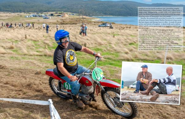 A campground offered home to many more motorcycles , adventure , street , and more , all represented amongst an array of tents , vans , and campers . A community feel similar to that of a small country town , highlighted by the Tasmanian location , everyone leant a hand when heavy overnight rain soaked the ground , bikes , cars , and trucks , all bogged . Many more laughs .