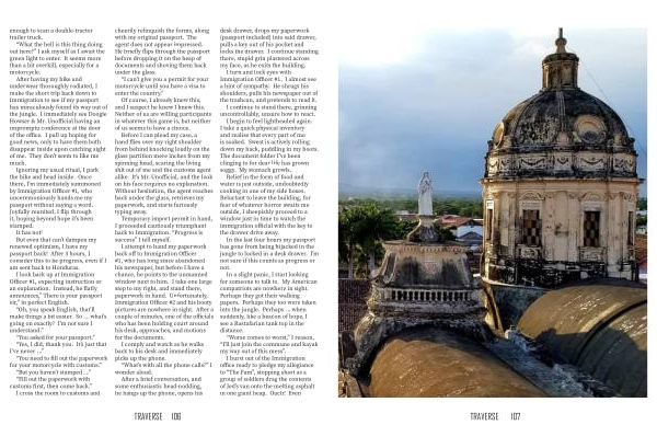 I ’ ve never …” “ You need to fill out the paperwork for your motorcycle with customs .” “ But you haven ’ t stamped …” “ Fill out the paperwork with customs first , then come back .” I cross the room to customs and cheerily relinquish the forms , along with my original passport . The agent does not appear impressed . He briefly flips through the passport before dropping it on the heap of documents and shoving them back under the glass .