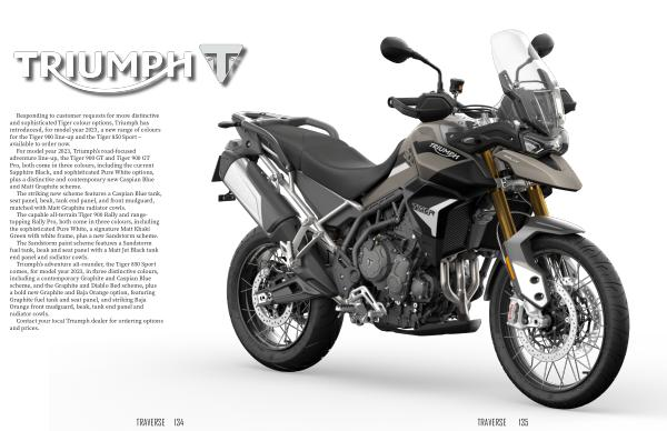 Responding to customer requests for more distinctive and sophisticated Tiger colour options , Triumph has introducesd , for model year 2023 , a new range of colours for the Tiger 900 line-up and the Tiger 850 Sport – available to order now .