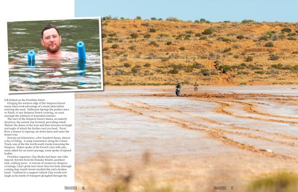 Frontline organiser , Clay Marks had been one rider injured , thrown from his Yamaha Ténéré , pestilent luck , nothing more . A veteran of numerous Simpson crossings , Clay ’ s pride hurt more than his body although coming days would reveal cracked ribs and a broken hand . Confined to a support vehicle Clay would now laugh as his mode of transport ploughed through the