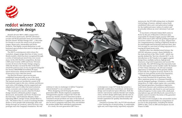 Honda ’ s other two-wheeled award winner , the ADV350 ‘ adventure scooter ’, draws faithfully on the look and feel of the 750cc X-ADV – which was quickly dubbed the ‘ first two-wheeled SUV ’ on its introduction in 2017 thanks to its rugged , angular design lines , multiple surfaces , high ground clearance , long travel suspension and scooter-like practicality . The ADV350 brings this innovative look to the mid-capacity scooter market under the banner of ‘ New Urban Adventure ’. Its off-road oriented appearance is matched with the genuine ability to deal with the roughest of tarmac thanks to its unique-in-class genuine motorcycle suspension .