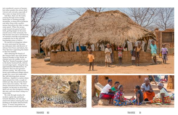 After admiring the beauty of the Victoria Falls , one of the Seven Natural Wonders of the World , we climbed onto the saddles of our “ Big Five ” Honda Transalps to head to the Kafue National Park , Africa ’ s second largest park . Along the way , approximately 800 kilometres , we started to discover this genuine African country . We rode across farms and traditional villages where people live a poor but respectable life , still following their ancient traditions . Zambia is a nation where many people live with a couple of dollars per day , but poverty almost never turns into misery . We were always welcomed and every time we stopped , we became an attraction ; there are very few foreigners coming this way , and even fewer riding on a motorcycle .