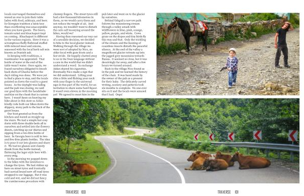 In keeping with traditions , a toastmaster was appointed . That bottle of water at the end of the table wasn ’ t water . Once again , we found ourselves obligated to knock back shots of Chacha before the day ’ s riding was done . We were yet to find a place to stay , and the locals pointed us down the road to a guest house . As the daylight was fading and the pub was closing , we said our good-byes with the handshake and kiss on the cheek that is custom here . I wasn ’ t keen on heaving my bike about in this state so Aidan kindly rode both our bikes down the slippery , stony path to the back of the guest house .