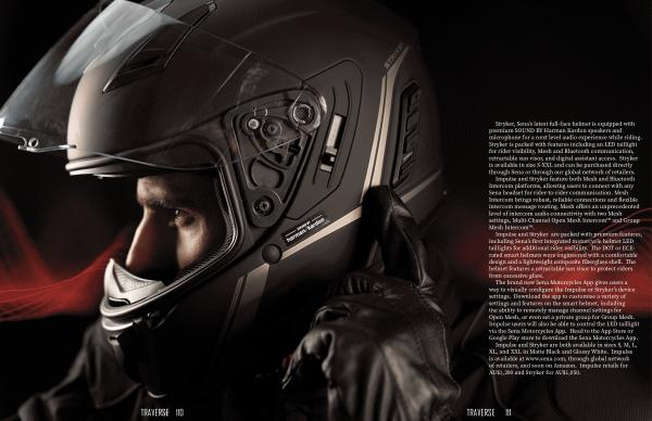 Stryker , Sena ’ s latest full-face helmet is equipped with premium SOUND BY Harman Kardon speakers and microphone for a next level audio experience while riding . Stryker is packed with features including an LED taillight for rider visibility , Mesh and Bluetooth communication , retractable sun visor , and digital assistant access . Stryker is available in size S-XXL and can be purchased directly through Sena or through our global network of retailers .
