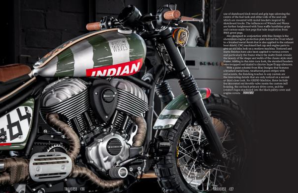 With a paint scheme from Rise Designs that features a brushed metal base , weathered green stripes with red accents , the finishing touches to any custom are the interesting details that are only noticed on a second or third close look . For GRIND Machine , these include the decorated red throttle valve inside the custom bell housing , the cut back primary drive cover , and the creator ’ s logos machined into the black pulley cover and engine covers . TRAVERSE