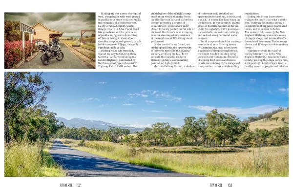 Small outposts dotted the roadway , remnants of once thriving towns like Bunnan , the local school now a paddock of shoulder high weeds , the single wooden building lying dormant and vulnerable . Evidence of a camp draft arena and tennis courts succumbing to the ravages of time , mother nature and dwindling populations . Riding into Scone I saw a town trying to be more than what it really was . Outlying residential areas , a competition of big gates , manicured lawns , and expensive vehicles . The main street , formerly the New England Highway , was now a scene of empty shops , and minimal traffic . I wondered how many Thai massage places and $ 2 shops it took to make a town ?